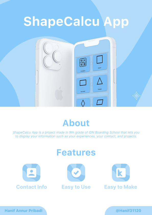 Shape Calculator ShapeCalcu App is a project made in 9th grade of IDN Boarding School that lets youto display your information such as your experiences, your contact, and projects.